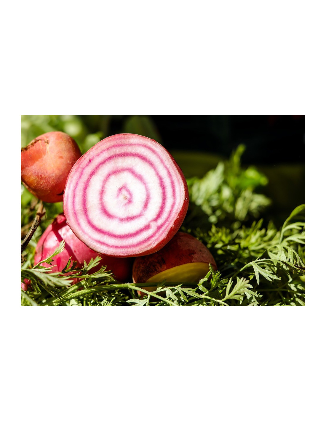 La betterave potagère Chioggia est une variété précoce qui produit des racines assez grosses très caractéristiques. La racine est couleur rouge cerise mais à l’intérieur la chaire est blanche avec des cercles rouges ressemblant à une cible. Cette variété originale est appréciée des cuisiniers pour décorer les assiettes et faire de belles créations autour de la betterave. Cette variété de graines de betteraves se sème de mars à juin pour une récolte de juillet jusqu’aux gelées (novembre). Pour se développer, elle aura besoin d’être placée dans un endroit ensoleillé à mi-ombre. Le sol devra être argilo-limoneux et de préférence riche, léger et bien drainé, pour exprimer tout son potentiel. La densité de plantation est de 20 cm entre chaque plant pour que la croissance s’effectue correctement. A maturité, la betterave aura une hauteur de 40 cm et une envergure de 15 cm.