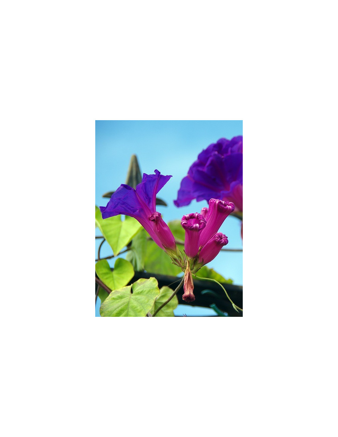 L'Ipomée volubilis variée se distingue par ses fleurs éclatantes qui peuvent être de différentes couleurs, notamment le bleu, le rose, le violet et le rouge. Les fleurs ont une forme en entonnoir et sont généralement assez grandes. Le feuillage est généralement en forme de cœur, vert foncé et luxuriant. Les lianes grimpantes s'enroulent autour des supports pour créer un magnifique rideau de fleurs dans le jardin. L'Ipomée volubilis variée est facilement reconnaissable grâce à ses fleurs vibrantes et à sa croissance grimpante.