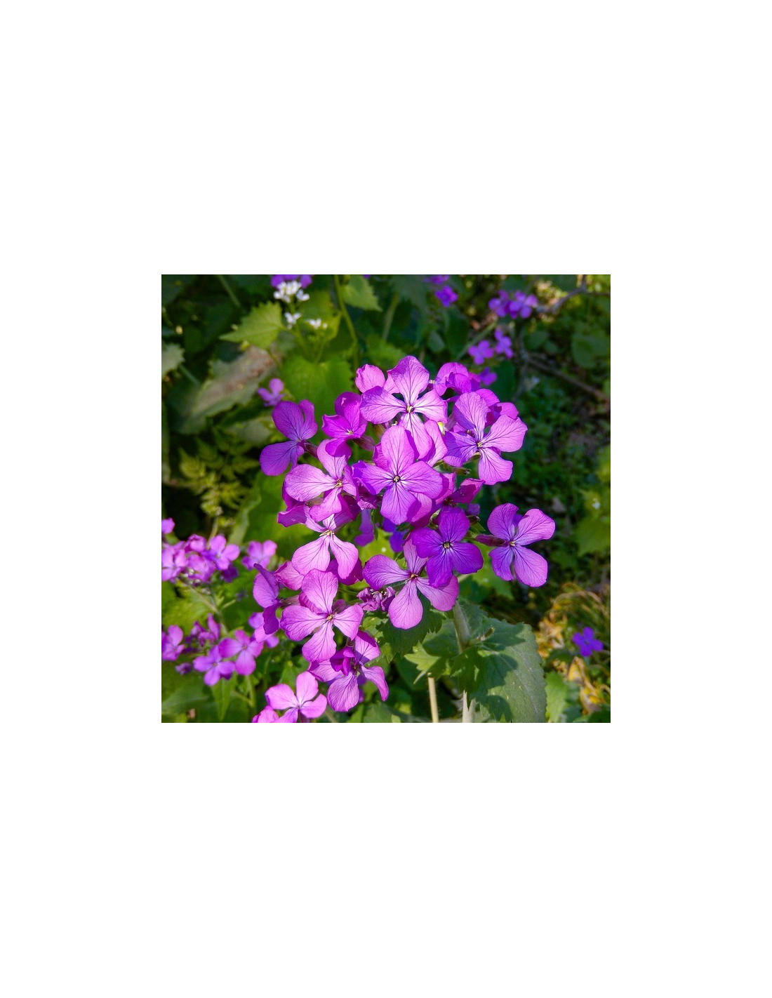 Identification des fleurs : Au printemps, la Monnaie du Pape produit des grappes de petites fleurs. Ces fleurs, souvent de couleur violette ou pourpre, parfois blanches, sont composées de quatre pétales disposés en croix. Elles sont généralement regroupées au sommet des tiges, offrant un contraste saisissant avec le feuillage vert.