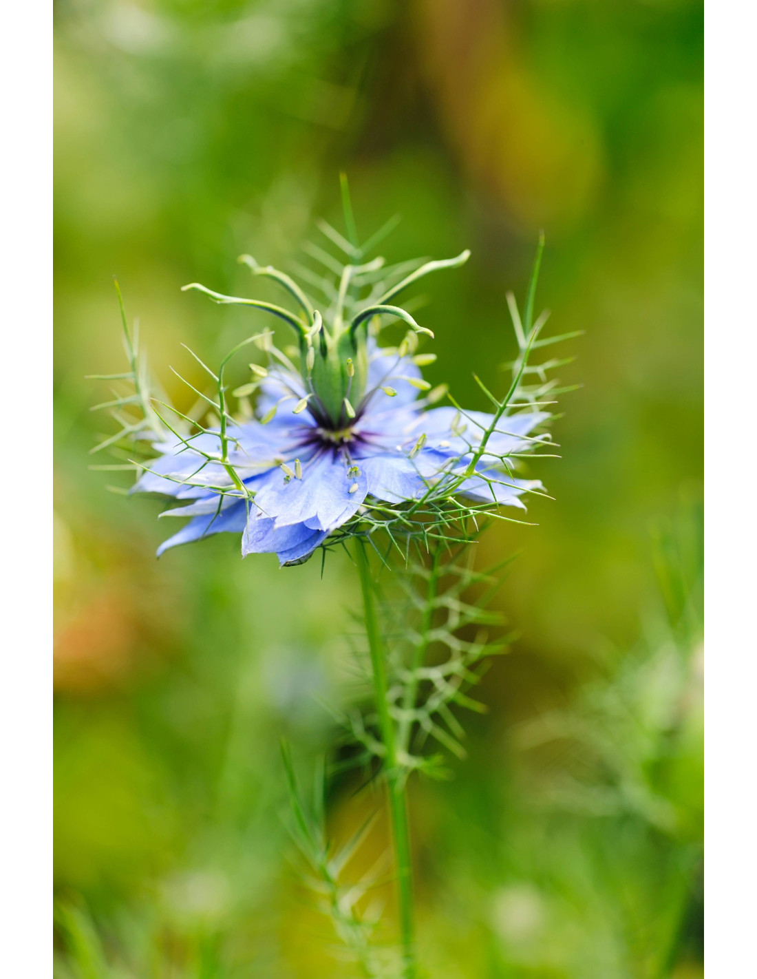 En termes d'apparence générale, la Nigelle de Damas Miss Jekyll Bleue atteint habituellement une hauteur de 45 à 60 cm. Elle se caractérise par une structure droite et fine, avec des tiges délicates et ramifiées. Son feuillage, finement découpé et rappelant celui du fenouil ou de l'aneth, est d'un vert tendre. Les feuilles, alternes, sont divisées en de nombreux segments étroits, conférant à la plante un aspect léger et aéré.