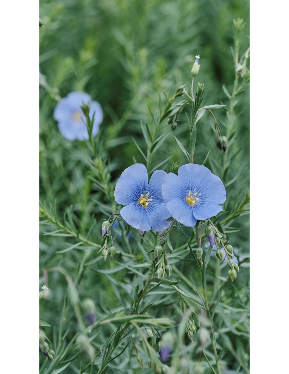Le feuillage du Lin vivace bleu est également caractéristique. Les feuilles sont petites, étroites et de forme lancéolée, présentant une couleur verte tendre. Elles sont disposées de manière alternée le long des tiges, ce qui confère à la plante un aspect léger et délicat. Cette texture fine du feuillage fait un excellent contraste avec les fleurs bleues et ajoute une dimension visuelle supplémentaire à la plante.