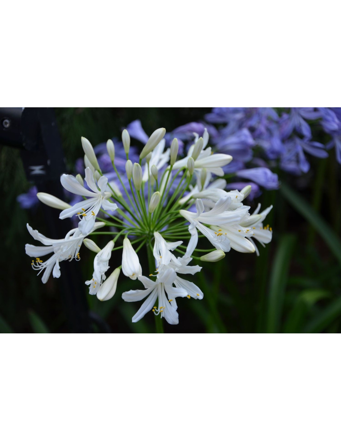 Arrosez modérément, en permettant au sol de sécher légèrement entre les arrosages. Fertilisez avec un engrais complet au début du printemps et en été pour promouvoir une floraison abondante et saine. Croissance : L’agapanthe blanche atteint généralement une hauteur de 60 à 100 cm. Elle forme des touffes de feuilles vertes en forme de sangle qui ajoutent un intérêt visuel même lorsque la plante n'est pas en fleur.Floraison :